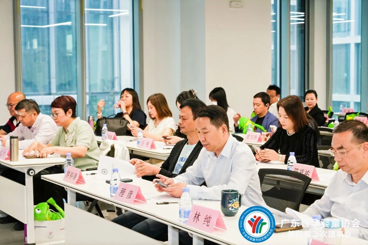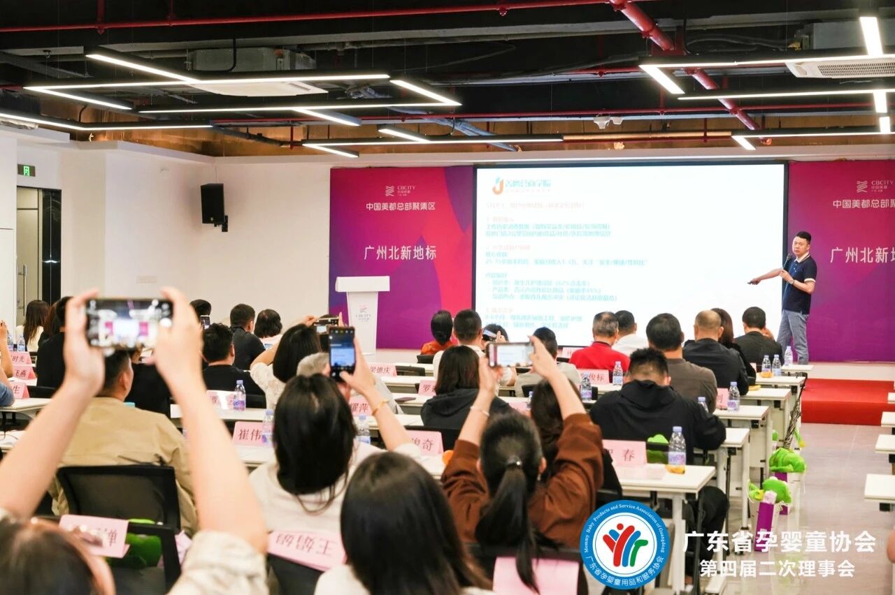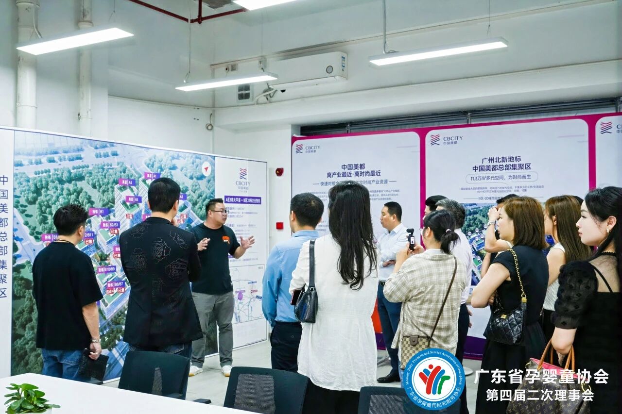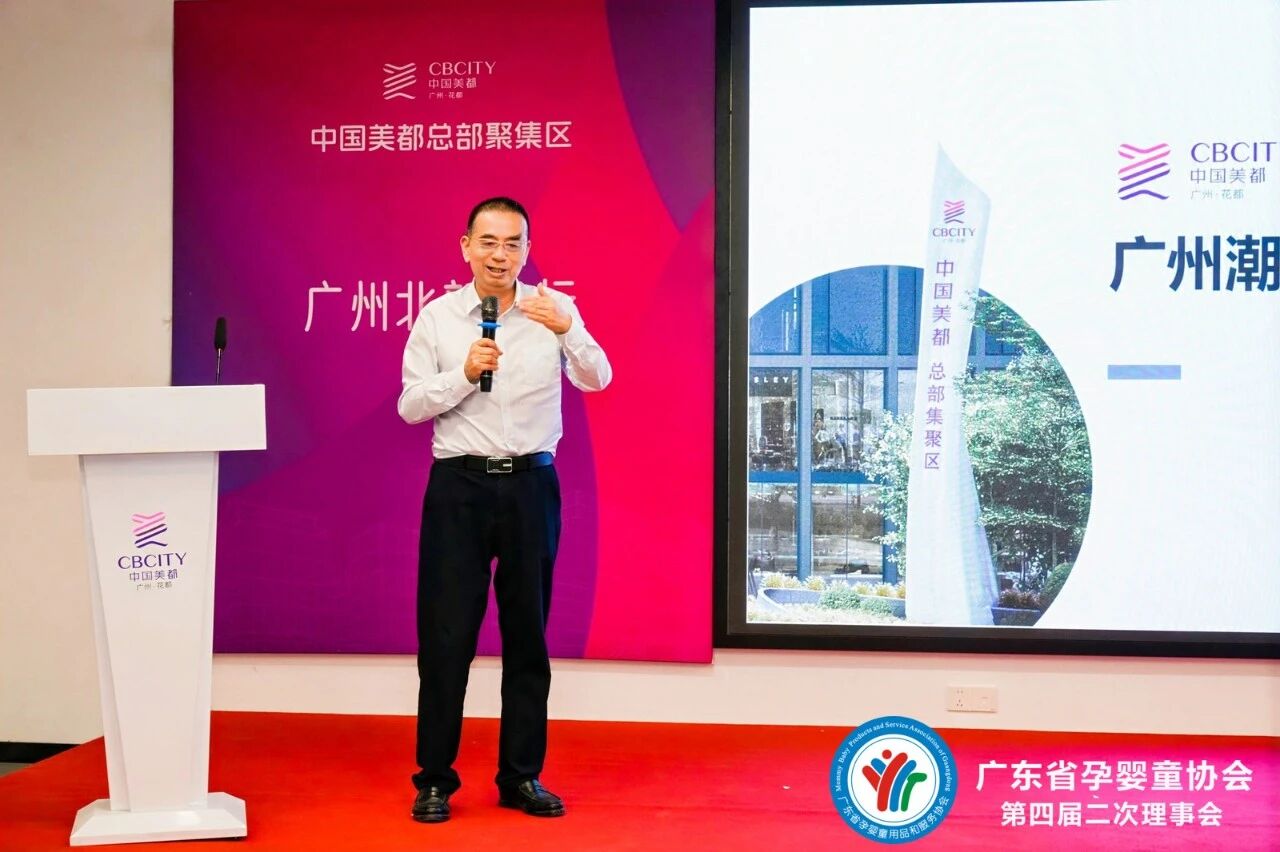 随后全体参会代表在园区会议室召开理事会议。杨秀清秘书长主持并逐一介绍了领导与嘉宾。广州市人大代表、中国美都、科盈集团董事长、花都区化妆品行业协会会长、广东婴童协会副会长、林纯先生致欢迎辞,林董事长介绍了中国美都总部集聚区的发展优势与战略规划,他说到,作为广州市重点产业园区,中国美都总部以11.3万㎡产业综合体为载体,打造集总部办公、研发创新、跨境展贸于一体的多元空间。园区创新搭建“5+6+7”三维服务体系,提供从研发对接、专利预审、跨境资源对接等全链条服务。中国美都將以‘新质生產力’驱动产业升級,以‘空铁速度’連接全球机遇,携手各行业共创繁荣未来。中国美都诚挚欢迎各位母婴企业深入了解、携手加入,共同开创美好未来!